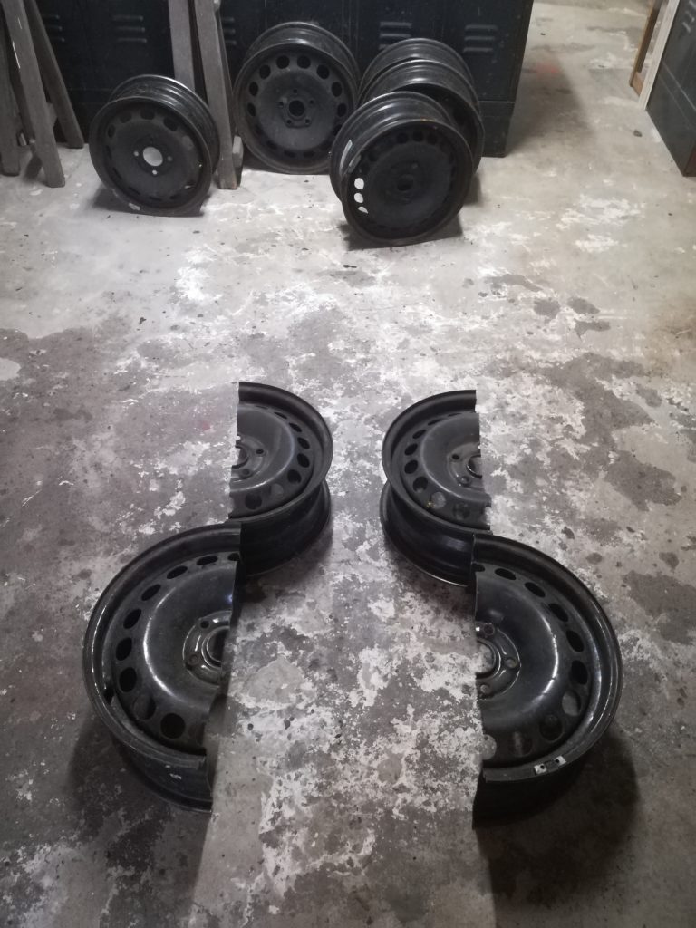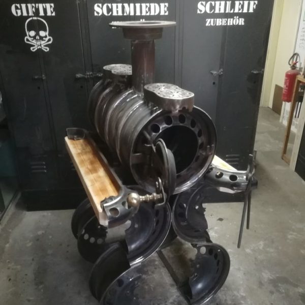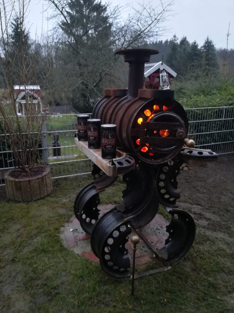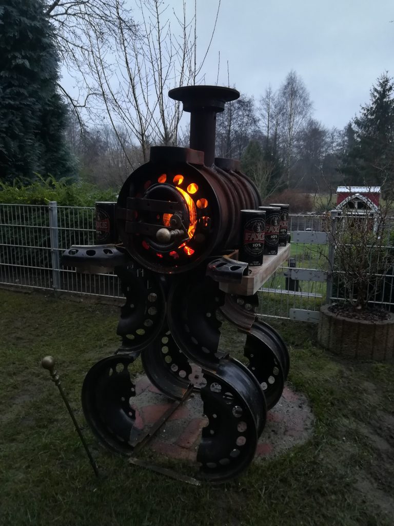 Die Felgen, einst auf der Straße unterwegs, erhielten eine neue Bestimmung: sauber verschweißt, funktional umgebaut und mit einem einfachen, aber wirkungsvollen Zugsystem versehen. Das Ergebnis ist ein robuster, rustikaler Ofen, der nicht nur nachhaltig ist, sondern auch ordentlich Wärme spendet.
