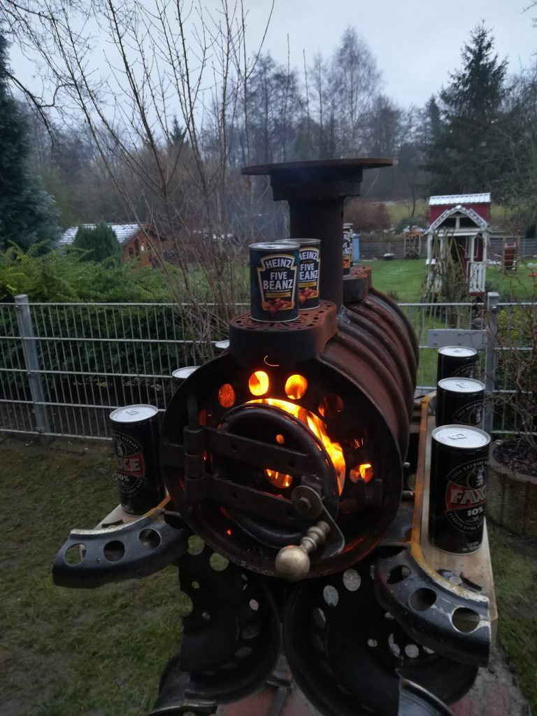 An kalten Wintertagen lässt es sich wunderbar am Feuer sitzen, den Flammen zusehen und dabei ein Bier genießen – einfach, ehrlich, gemütlich. Und wer mag, kann auf der heißen Oberfläche sogar Konservendosen oder kleine Mahlzeiten erwärmen – ganz im Sinne des praktischen Handwerks und der gelebten Kreativität.